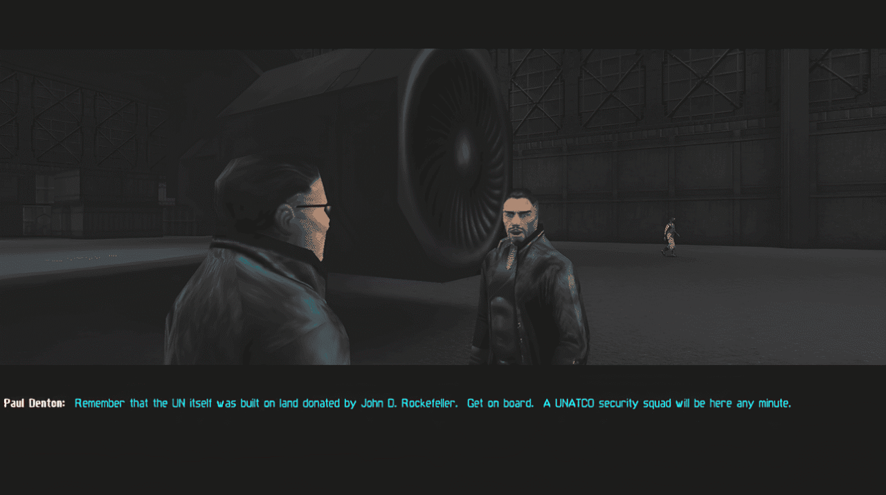 Paul Denton warns JC about the incoming UNATCO security squad, with subtle Illuminati undertones.