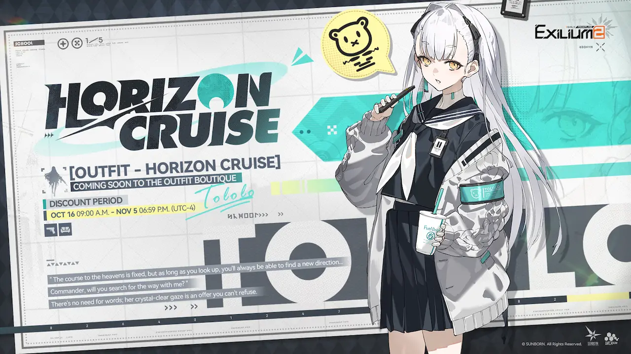 Tololo’s Horizon Cruise outfit is available in the Outfit Shop from October 16 – November 5 at a launch discount for $9.99 / 880 tokens.