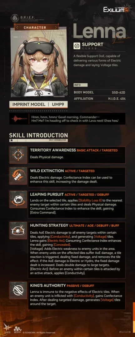 Lenna thrives in Electric squads that benefit from debuff stacking and frequent attacks. As her kit is designed around electric team use, her performance takes a huge hit trying to pair her outside of it.