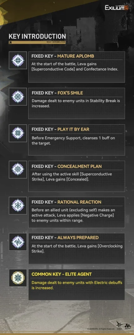 • Key 1: Mature Aplomb: At the start of the battle, gains 2 stacks of Superconductive Code and 1 Confectance Index