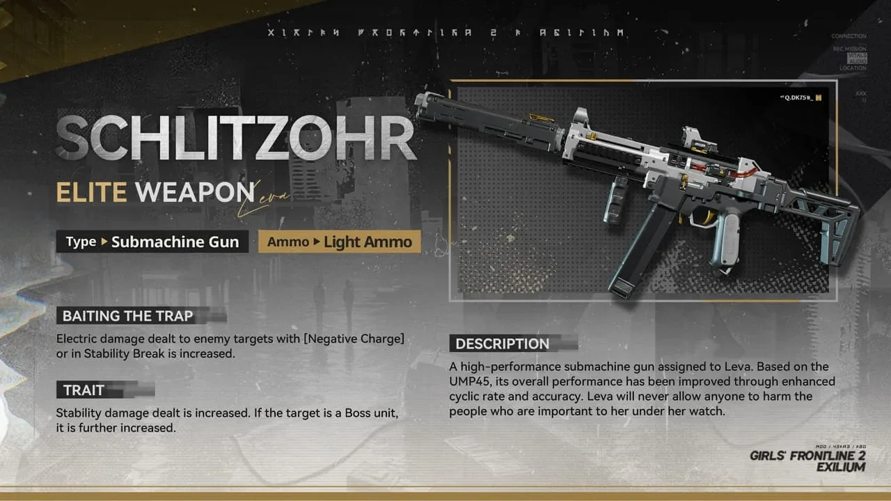 The weapon complements her Electric kit and debuff synergy but is not required. Budget choices like UMP-9 are solid, while higher-tier weapons such as Svarog or Classified Manuscript keep her competitive without heavy investment.