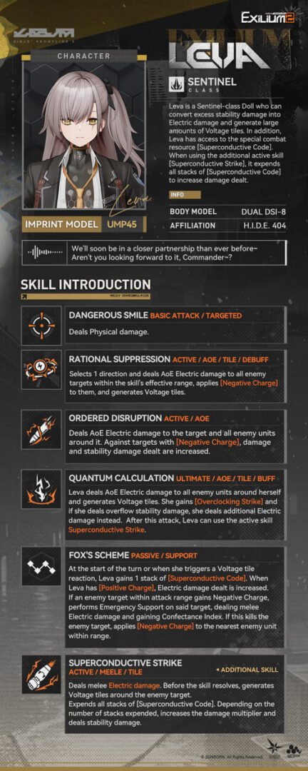 • Key 5: Rational Reaction: Before allies performs an active attack, applies Negative Charge to the enemy within range for 1 turn. Use it you’re not pairing with Belka or V1 Andoris Negative Charge.