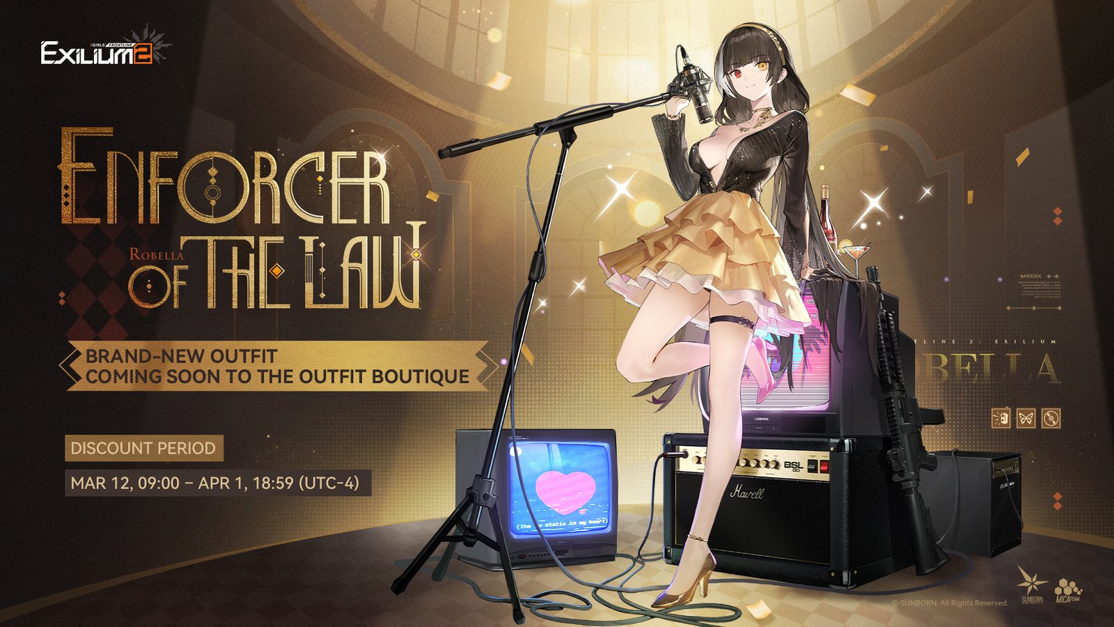 A new battle outfit with a cape for Lenna. On sale for a limited time discount from Feb 19 to March 11. Arriving alongside Voymastina, Robella receives a high-society makeover with the “Enforcer of the Law” gold dress. It is a sharp contrast to DEFY’s more grounded aesthetics, perfect if you want to add some flair to your command room.