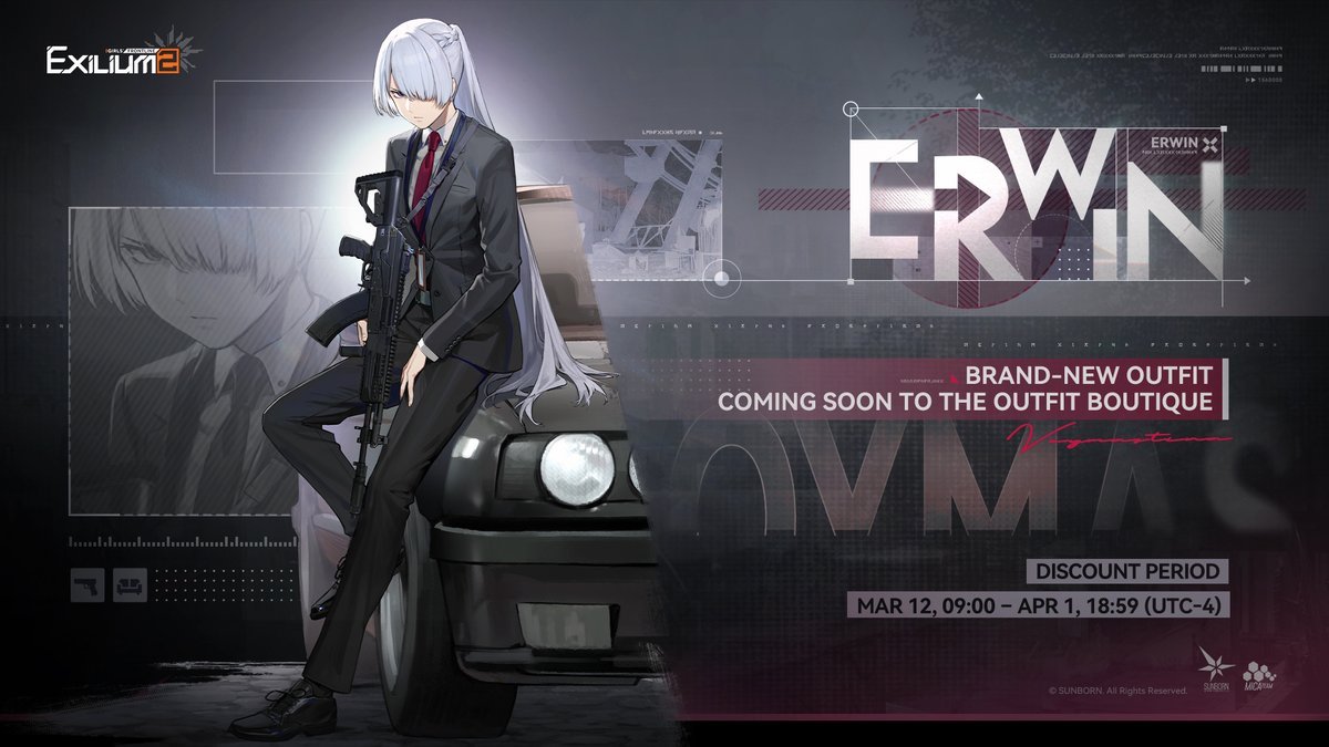 A business outfit with suit,slacks and tie for Voymastina. On sale for a limited time discount from Mar 12 to Apr 1. Leaning into her role as an elite operative, the Erwin outfit swaps the tactical rig for a sleek, professional suit. This is a limited-time addition to the boutique and includes new animations that maintain her “silent machine” persona.