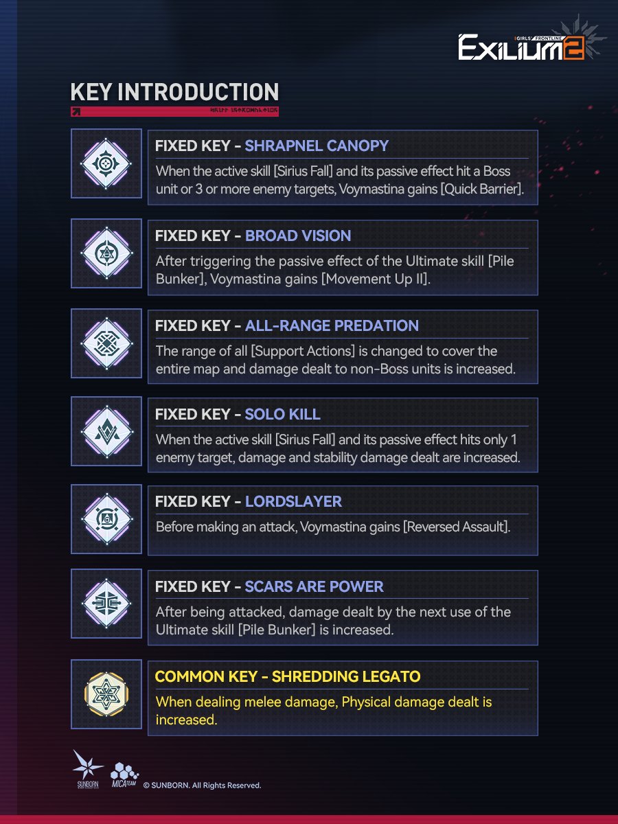 Voymastina is a physical AR sentinel. Her performance relies on the current state of physical damage; her buffs reach their peak effectiveness within teams dedicated to her damage type. She acts as a defense-ignoring specialist, scaling her damage proportionally as her total defense ignore increases.