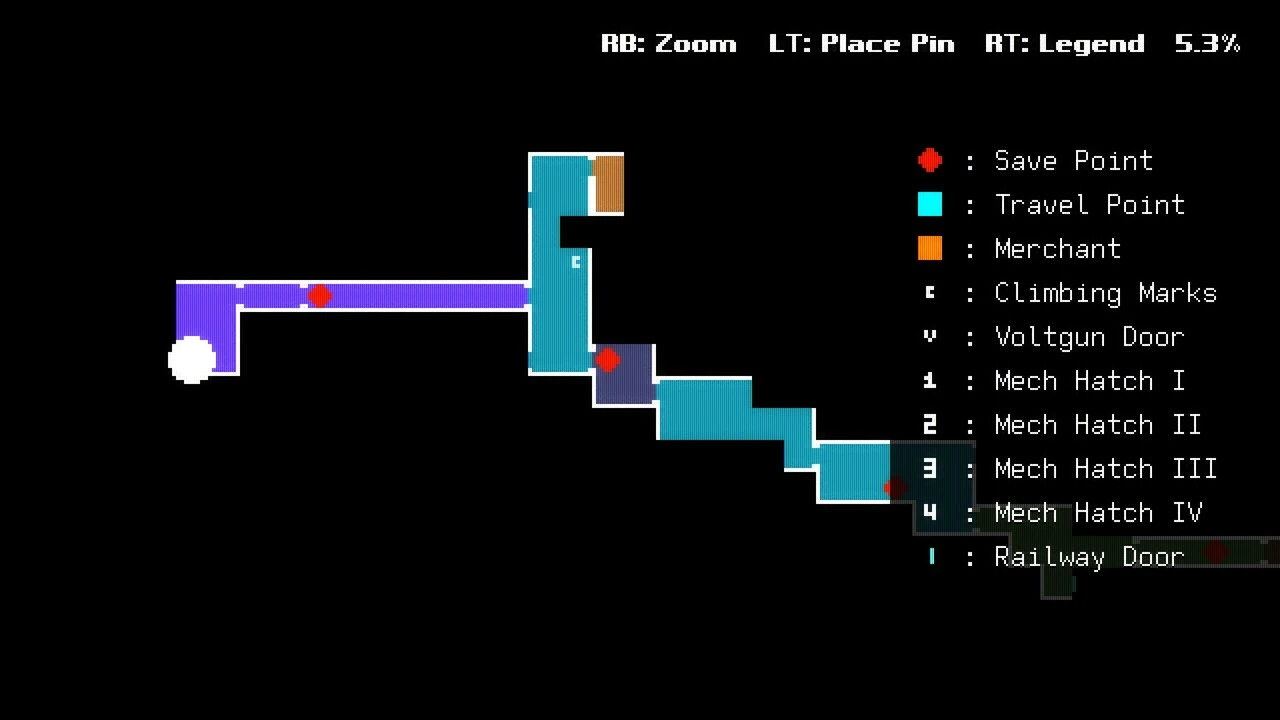 The large, interconnected map follows Metroidvania conventions with distinct zones and clear tracking of explored areas. Accessible from the pause menu, it gives players a solid overview of their progress. A pin system is also included, letting you mark locations with unreachable items or areas to revisit, perfect for players who want to keep their backtracking intentional.