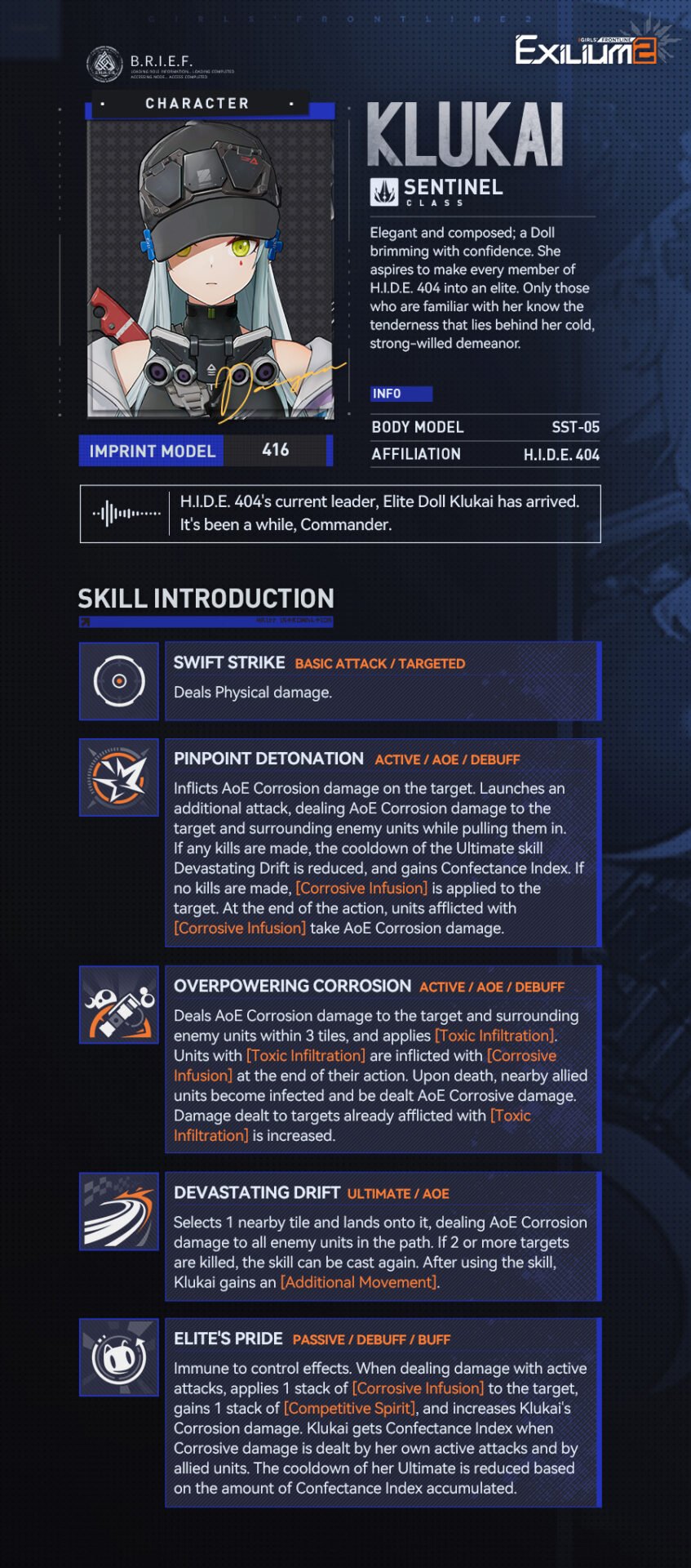 Klukai (HK416) is a Sentinel and the undisputed queen of AOE. Her kit centers on spreading Corrosion and exploiting the Devastating Drift ultimate, which resets its cooldown if she secures multiple kills. She is built to delete groups of enemies in a single turn, making her the fastest farmer in the game.