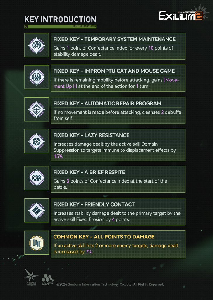 - Temporary System Maintenance (Fixed Key): Energy generation. She gains 1 Confectance for every 10 points of stability damage dealt.