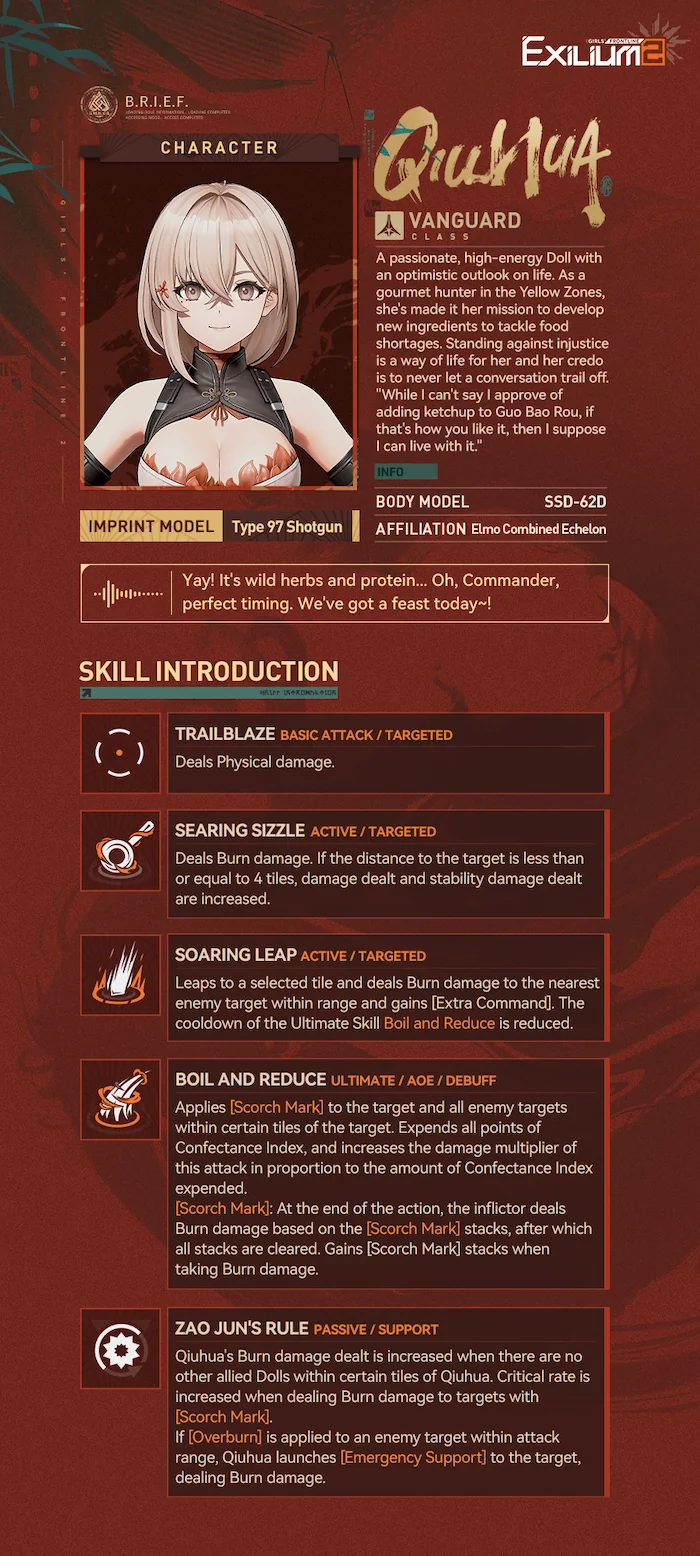 Voiced by fan favorite seiyuu Yuka Otsubo, Qiuhua is a ranged, AOE-focused Vanguard who excels in burn teams. She is currently one of the best dolls in the game for general content and functions as the primary catalyst for modern fire-based strategies.