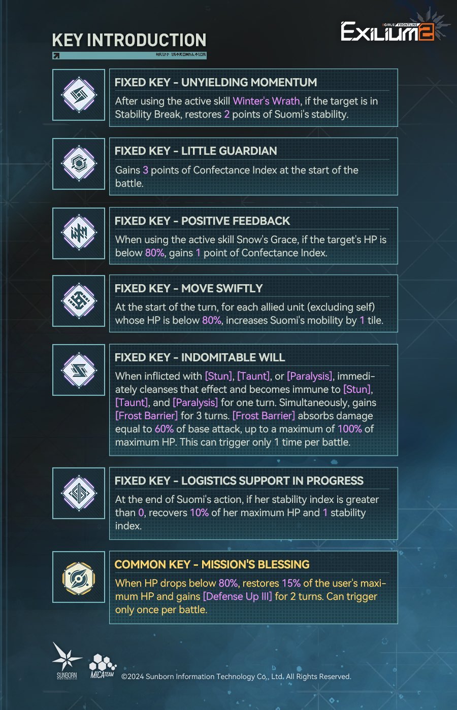 - Logistics Support in Progress (Fixed Key): Self-sustain. She recovers 10% max HP and 1 stability point at the end of her turn if her stability is above 0.