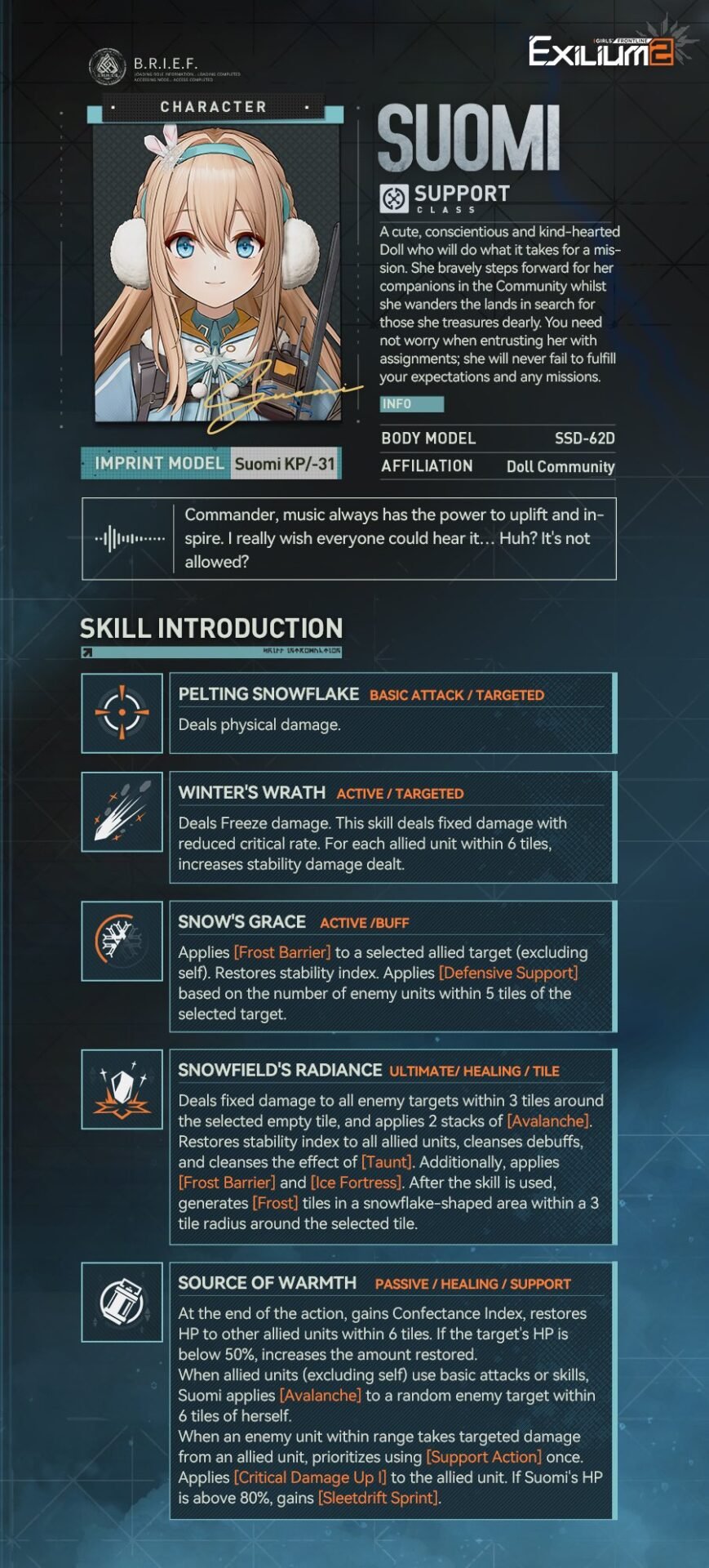 Suomi strives to be a reliable helping hand for any Commander.