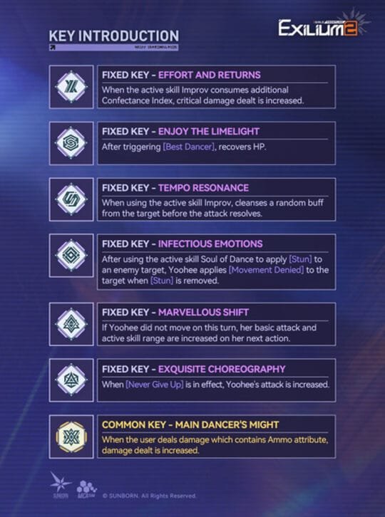 - Perfect Dance (Expansion Key): After using Sparkling Finale, she triggers Graceful Pirouette or Passionate Resonance on the two allies with the highest attack. Additionally, her Physical damage triggers Never Give Up, and the effect is no longer nullified when allies deal phase damage.
